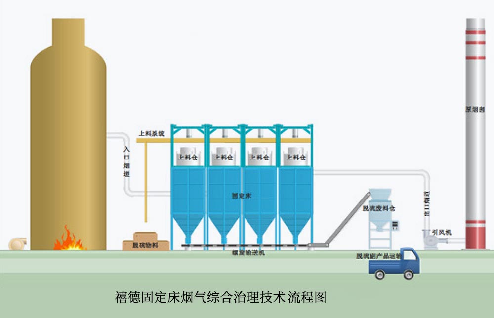 采用固定床工藝配合特制脫硫脫硝劑,脫硫脫硝除塵一體化處理,脫除效率達(dá)95%以上,吸收劑可回收用于建材制作;