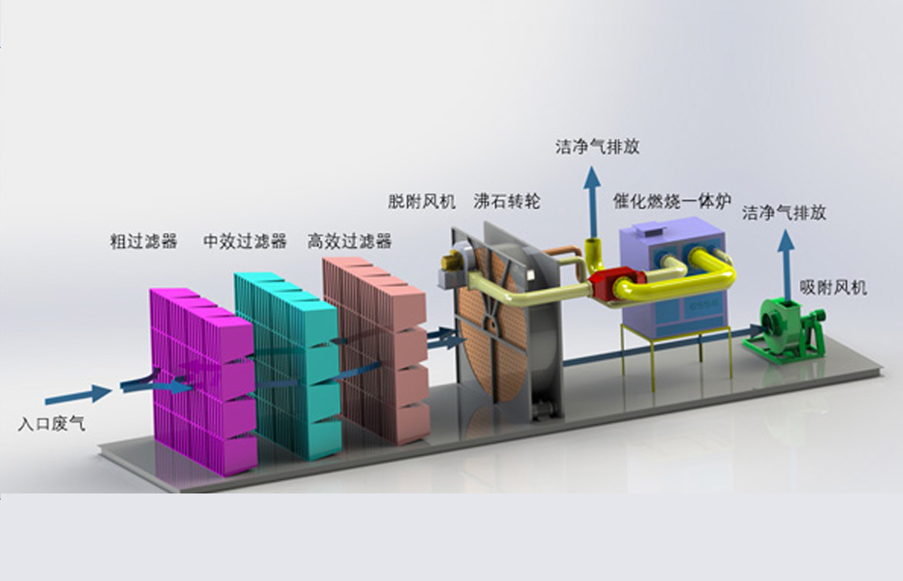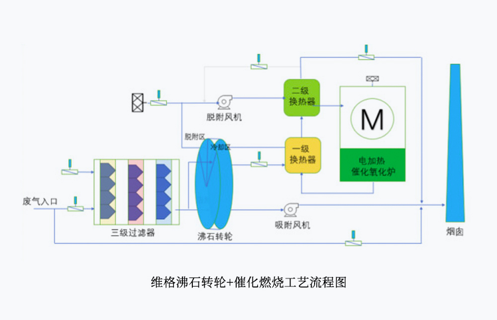 維格技術主要依據高效率吸附和低能耗催化氧化兩個基本原理設計開發,即吸脫附濃縮一催化氧化法,主要采用“沸石轉輪吸脫附濃縮+催化氧化”工藝。在低溫條件下,大風量、低濃度的VOCS通過沸石轉輪吸附凈化并脫附后轉換成小風量、高濃度有機廢氣,輸送到后端催化氧化系統進行氧化處理,處理效果可達98%以上。同時催化氧化過程中生成的熱量通過換熱系統應用于沸石轉輪脫附過程,實現熱量的高效利用。