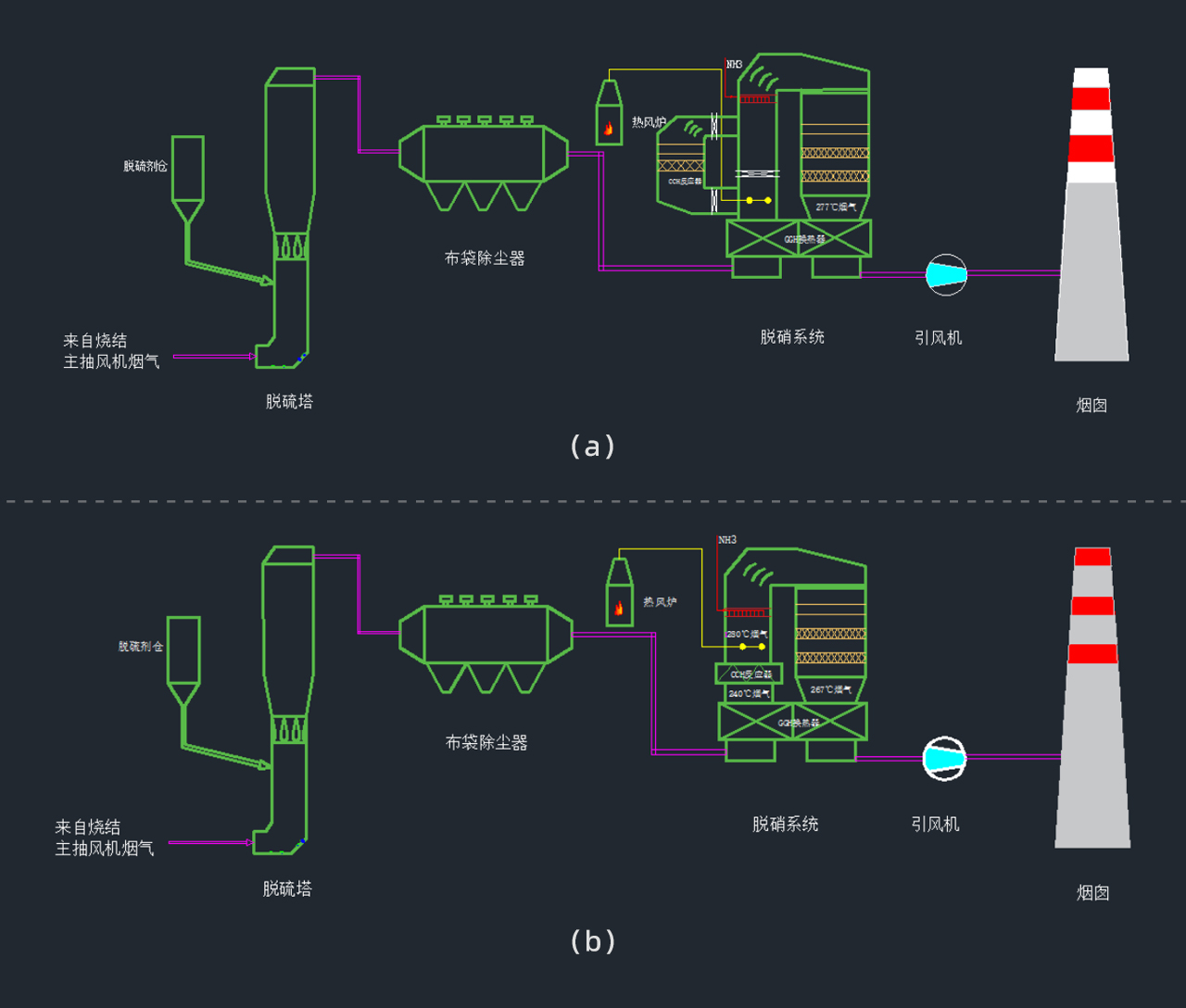 將脫硫和除塵后的煙氣通過引風機送入煙道內,煙氣進入GGH換熱器冷端預熱,煙氣預熱至220℃后再經過熱風爐系統,利用高爐煤氣對流經的煙氣進行加熱,使煙氣溫度上升至250℃左右,達到CO催化劑反應溫度范圍。煙氣進入CO催化反應器后,催化劑在高溫氣氛中氧化CO為CO2,釋放出大量的熱量。脫除CO后的高溫煙氣流經SCR脫硝系統,此時煙氣溫度在280℃左右,達到脫硝催化劑反應條件,NH3與煙氣中的NOx反應生成N2和H2O。脫NOx后的煙氣經出口煙道進入GGH換熱器熱端,溫度降至110℃-130℃后從煙囪排出。CO催化反應器反應產生的熱量將煙氣溫度提高35℃-50℃,有效實現了熱量的循環,使整個工藝的熱量形成閉環。